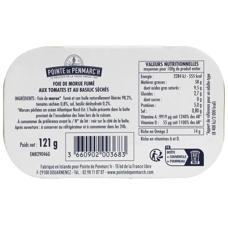 Ficat de COD afumat* și uleiul său eliberat natural 98,2%, roșii uscate 0,8%, sare, busuioc deshidratat 0,2%. *Cod pescuit în Oceanul Atlantic de Nord-E
