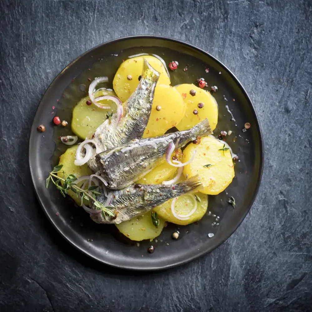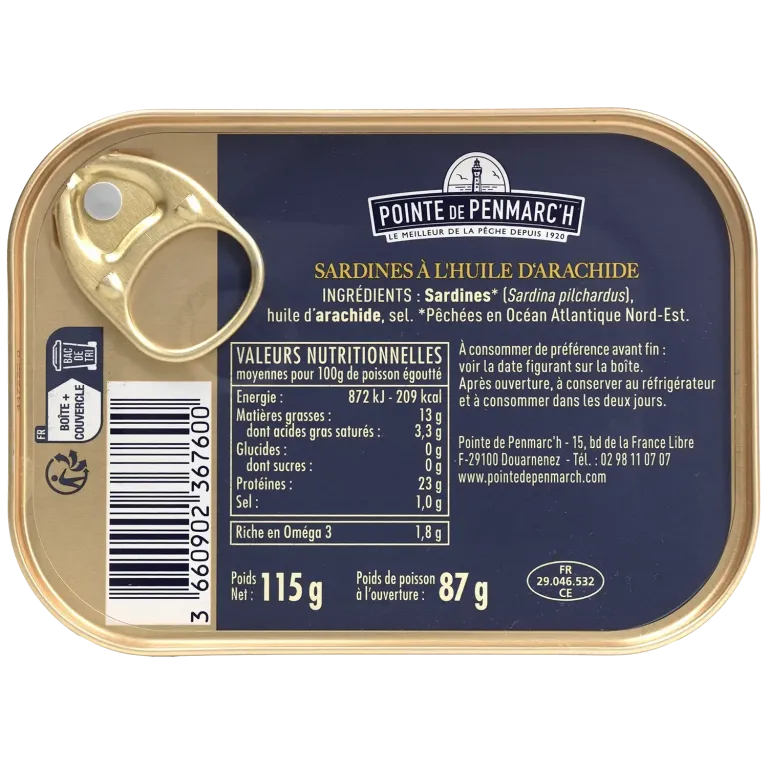 Sardine preparate în întregime manual, folosind cunoștințe ancestrale pe care le perpetuăm. După ce sunt decapitate și eviscerate, sardinele sunt conservate proaspete și acoperite cu ulei de arahide tradițional. În această rețetă, uleiul folosit provine dintr-o selecție de arahide din cele mai bune plantații. Deși rămâne gustoasă, această rețetă autentică își păstrează toate valorile nutriționale: omega 3, calciu, fosfor și vitamina D. Unele persoane pot avea o sensibilitate alergică la arahide.