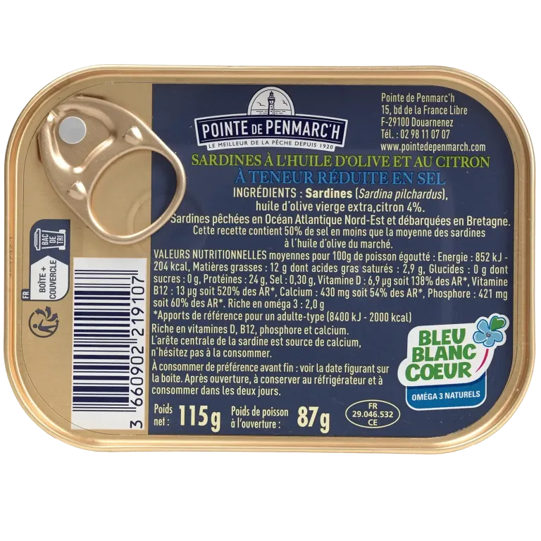 Sardinele noastre cu conținut redus de sare în ulei de măsline și lămâie poartă sigla Bleu-Blanc-Cœur deoarece au o superioritate nutrițională: sunt bogate în omega 3, în special acizi grași cu lanț lung, cum ar fi EPA și DHA, pentru a contribui la o sănătate bună. Consumul lor este esențial, pentru a contribui în continuare la un echilibru nutrițional optim. Valoarea nutrițională de referință în acizi grași pentru un adult care consumă 2000 kcal pe zi este de 250 mg pe zi pentru EPA și 250 mg/zi pentru DHA. Aportul de omega 3 la 100 g de sardine în ulei de măsline este de 2 g.