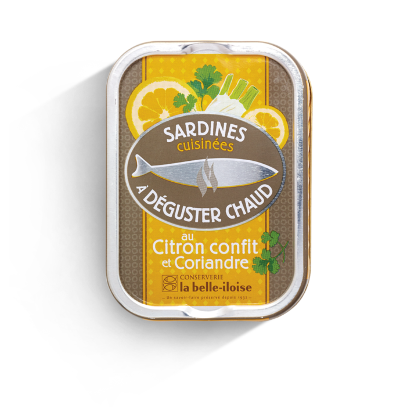 Sardine (55%), apă, ulei de măsline extravirgin, fenicul (5,8%), lămâie conservată în sare (4%), ghimbir, suc de lămâie (1,7%), amidon de cartofi, frunze de coriandru (0,8%), sare, ierburi. , extract de drojdie, condimente.